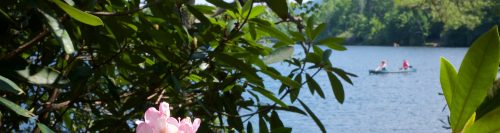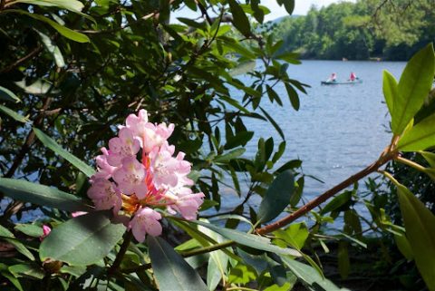 The location of this photo is Price Lake on the Blue Ridge Parkway in North Carolina. The lake has a trail that hugs the shoreline around the lake. If you take the walk when the Rhododendron are in bloom it is a very colorful stroll. When I saw this bloom I knew exactly the composition I wanted: the Rhododendron would be the focus of the shot, with the lake as a backdrop. I also wanted a canoe to be in the frame, but not be in sharp focus, because that would compromise the goal of highlighting the flower. Once I can composed the photo in my mind I just had to wait for a canoe to appear in exactly the right place in the frame. After waiting there for about 30 minutes, I finally had a canoe appear. I had previously set the camera for aperture priority, shutter speed was f/125 and Auto Exposure. I pointed the camera at the bloom, pressed the shutter button halfway down to get the auto focus on the bloom, moved the camera to the right to get the composition I planned, then pressed the shutter button down to get this shot. Lesson: middling skill coupled with perseverance can sometimes accomplish the desired results.
